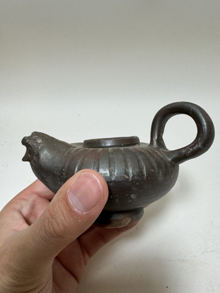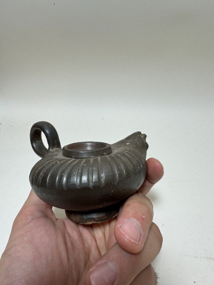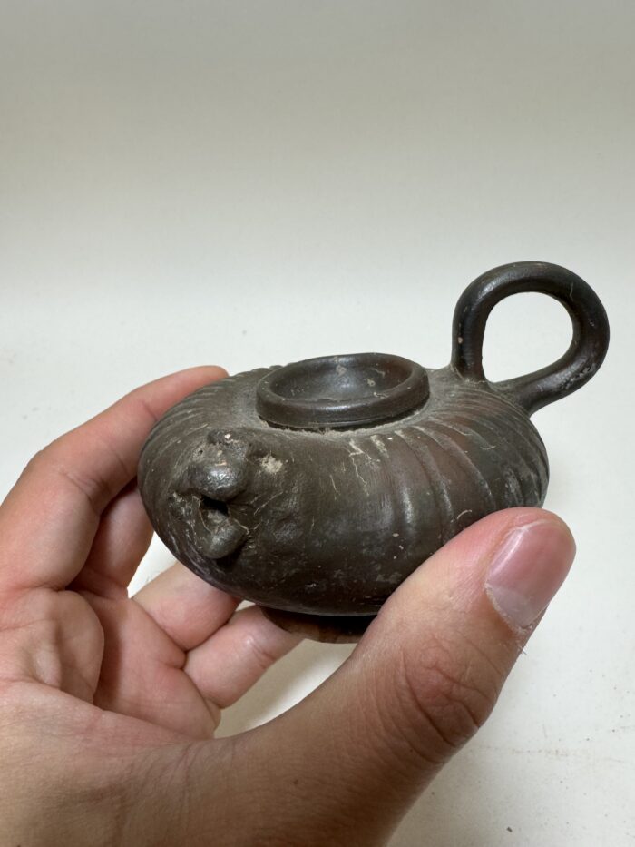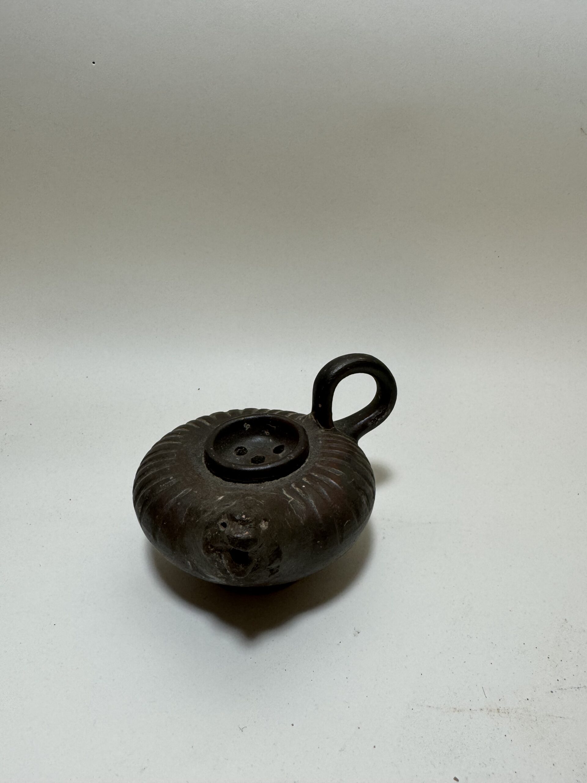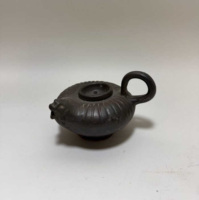 In the Classical world, even the most common household object could be touched with elegance and beauty. This charming vessel was used to pour oil into lamps that illuminated wealthy homes during the height of antiquity. The oil was filtered through the bottom central hole, and then poured out through the lion-headed spout. As we place our forefinger through the handle we are aware of ancient hands, forgotten by time, which held it just as we do. We make the gesture of pouring oil into a lamp and suddenly a room, a house, then an entire world comes alive in our imagination. Through such a simple action, we link ourselves intimately to the past. The central circular disk decorated with a standing nude male and a shielded warrior.